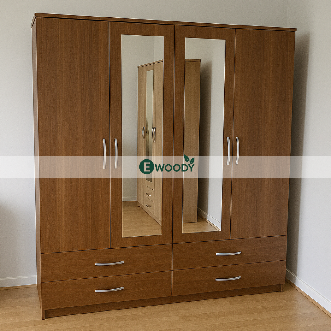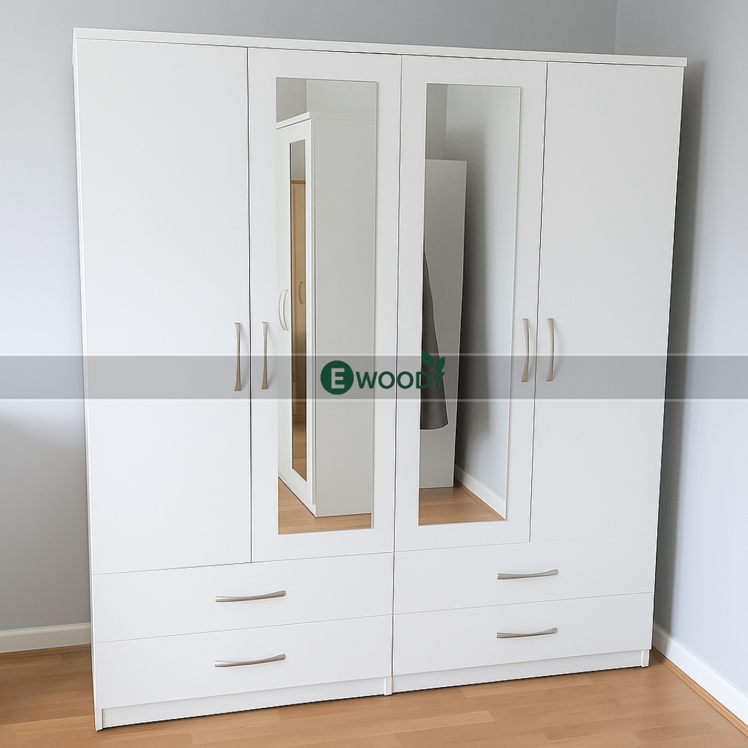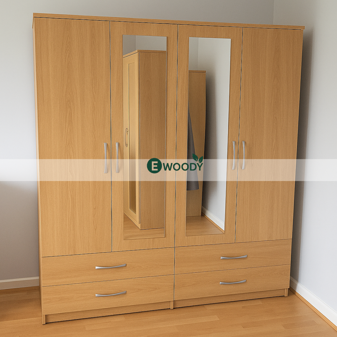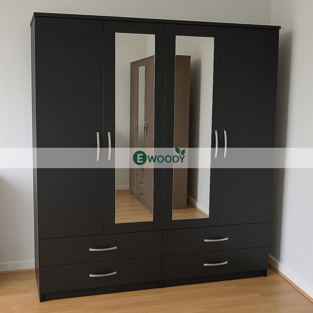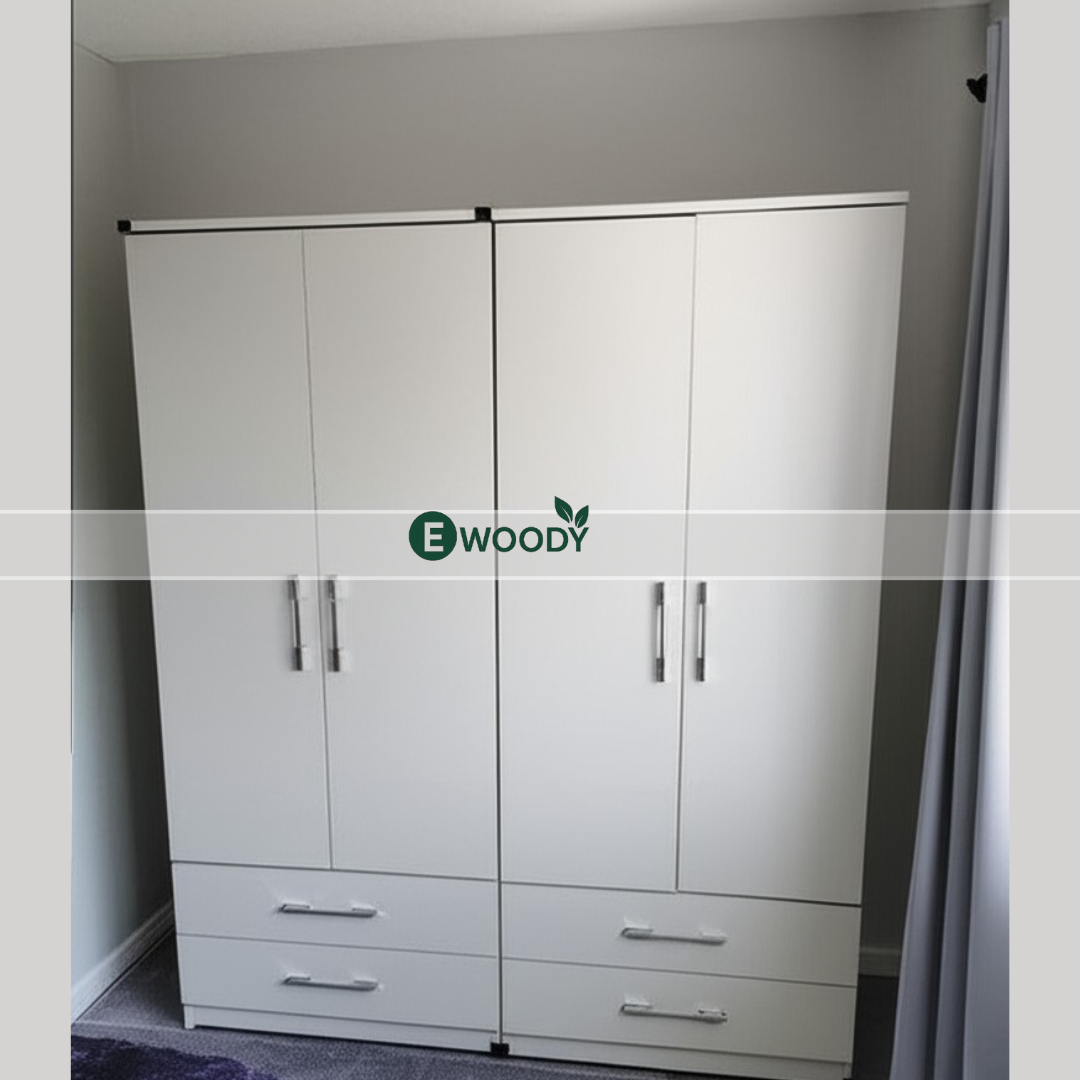 Upgrade your bedroom with this stylish and spacious 4-door wardrobe designed for both gents and ladies. Finished in a sleek look, this wardrobe offers ample storage with multiple shelves, a hanging rail, and two deep drawers for all your essentials.